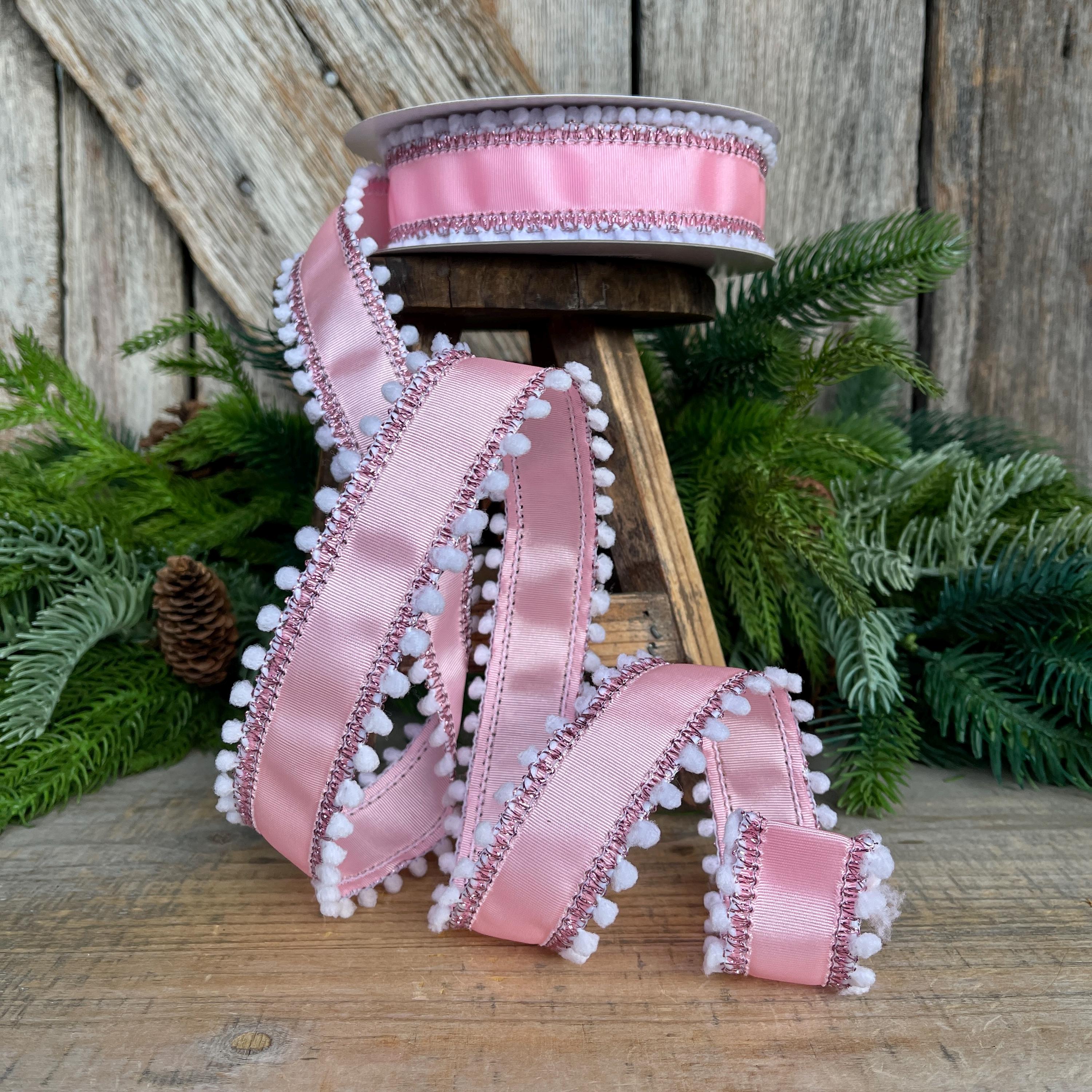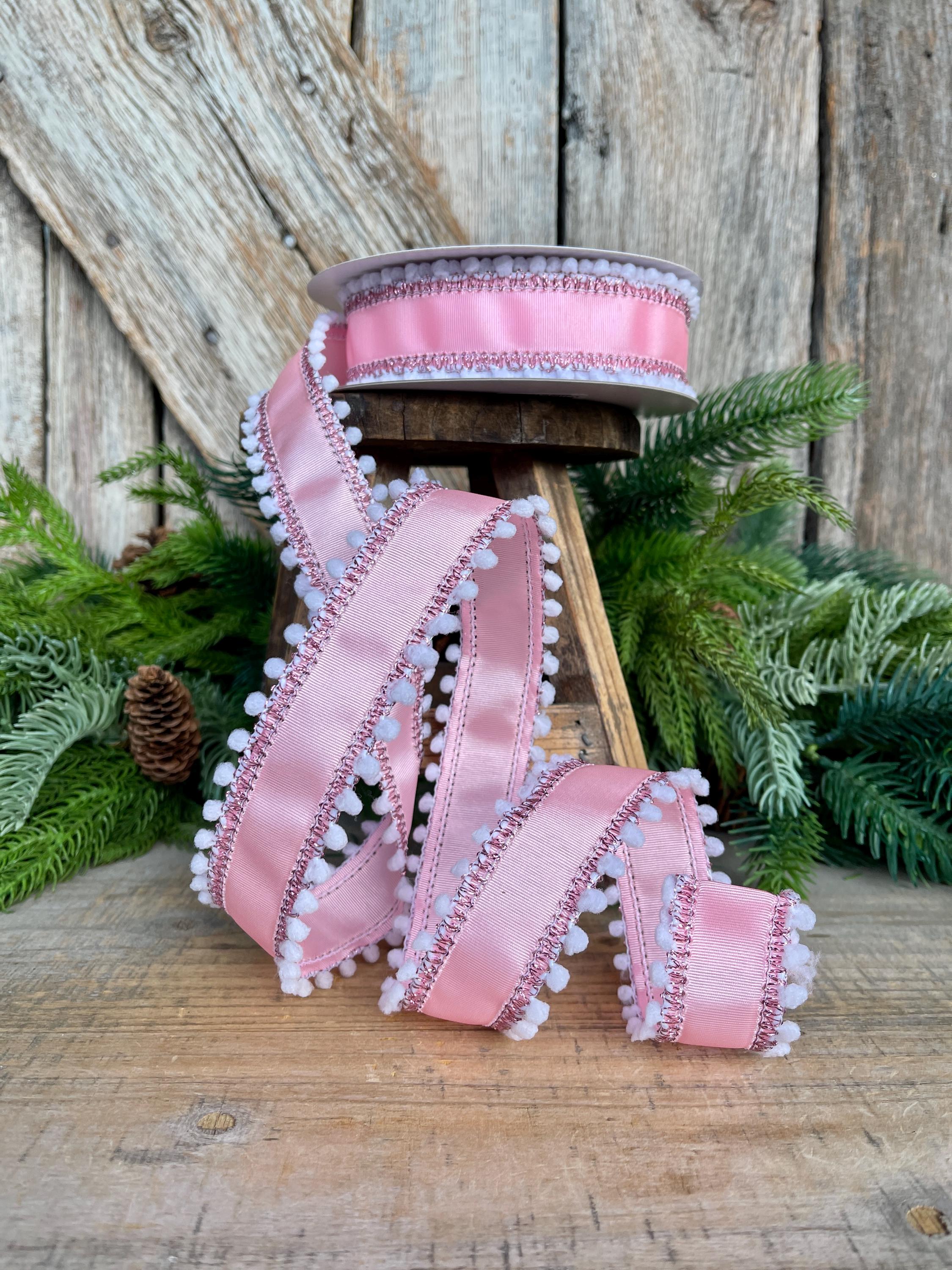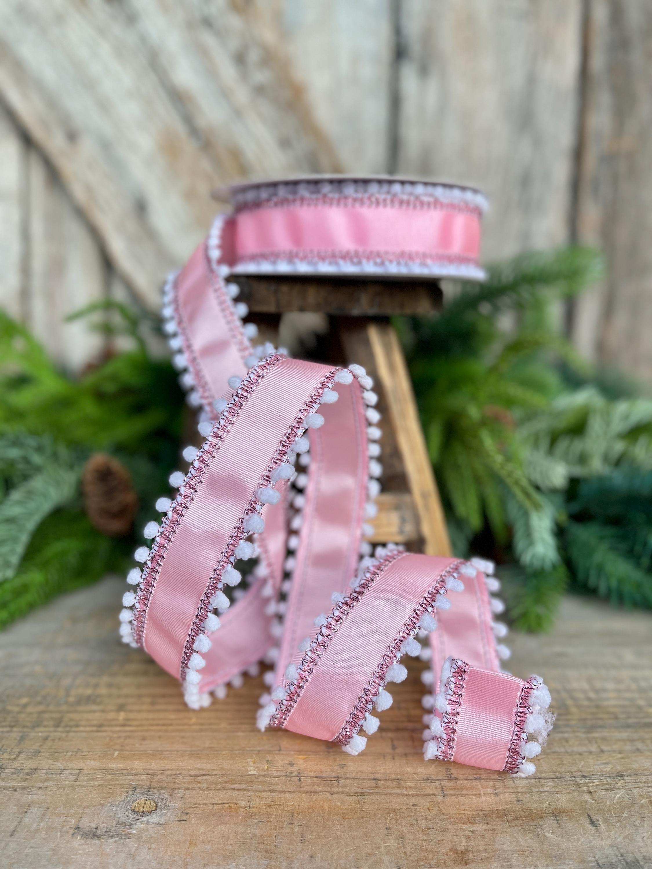Add a soft, whimsical touch to your designs with this 1.5-inch pink ribbed satin wired ribbon featuring white snowball pom edging. The subtle sheen of the ribbed satin paired with playful textured trim creates a charming, high-end look that stands out beautifully in bows and wreaths.