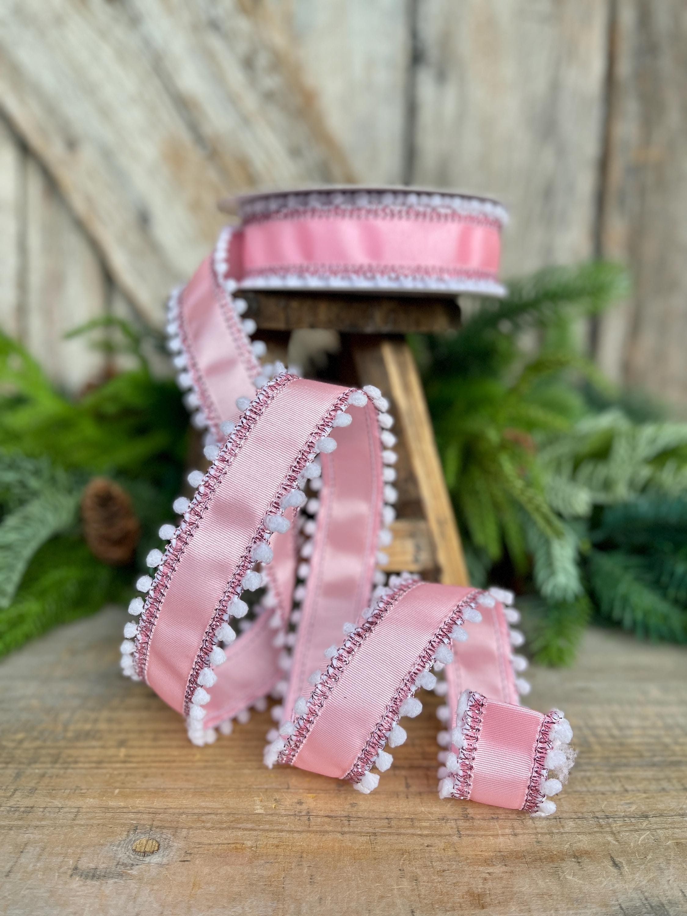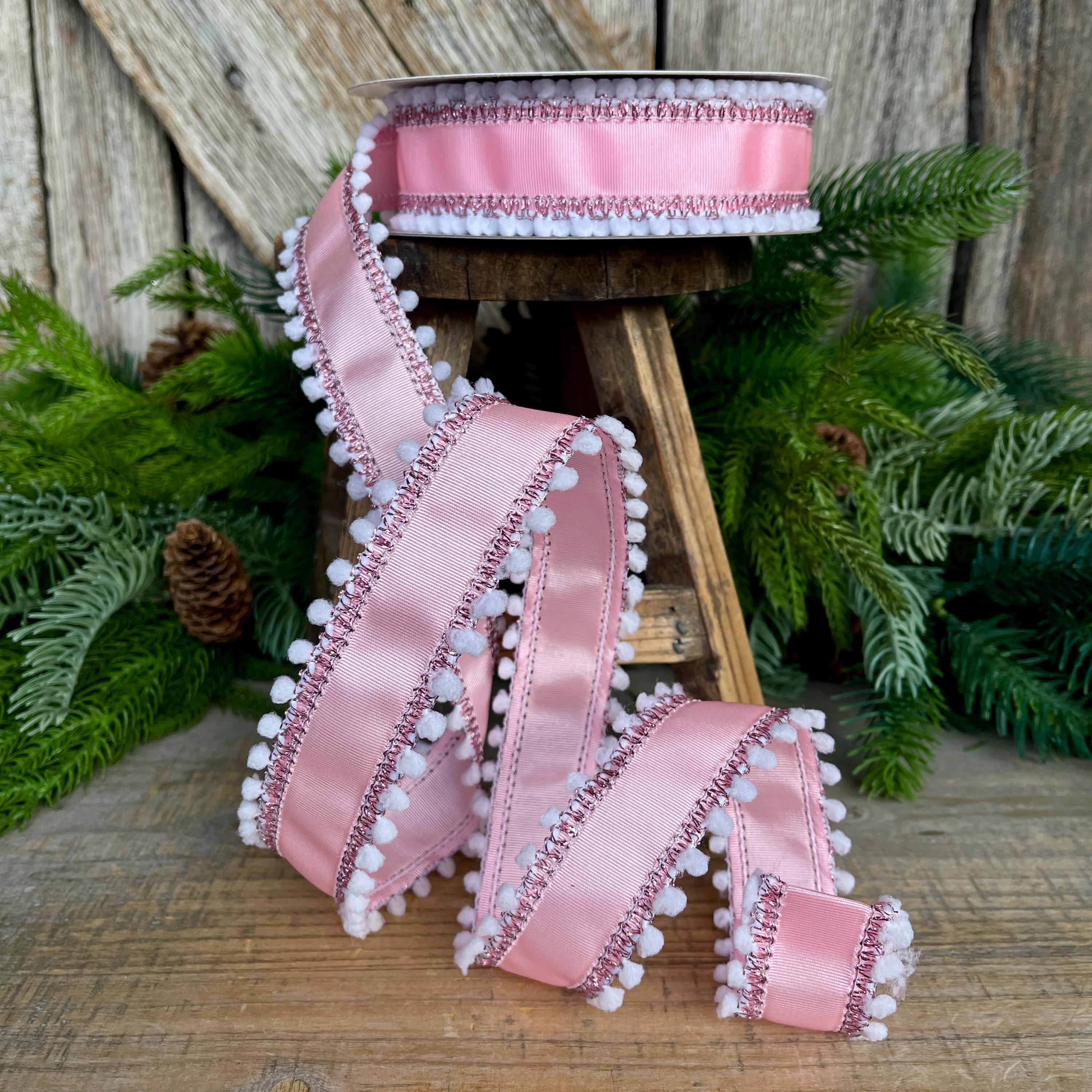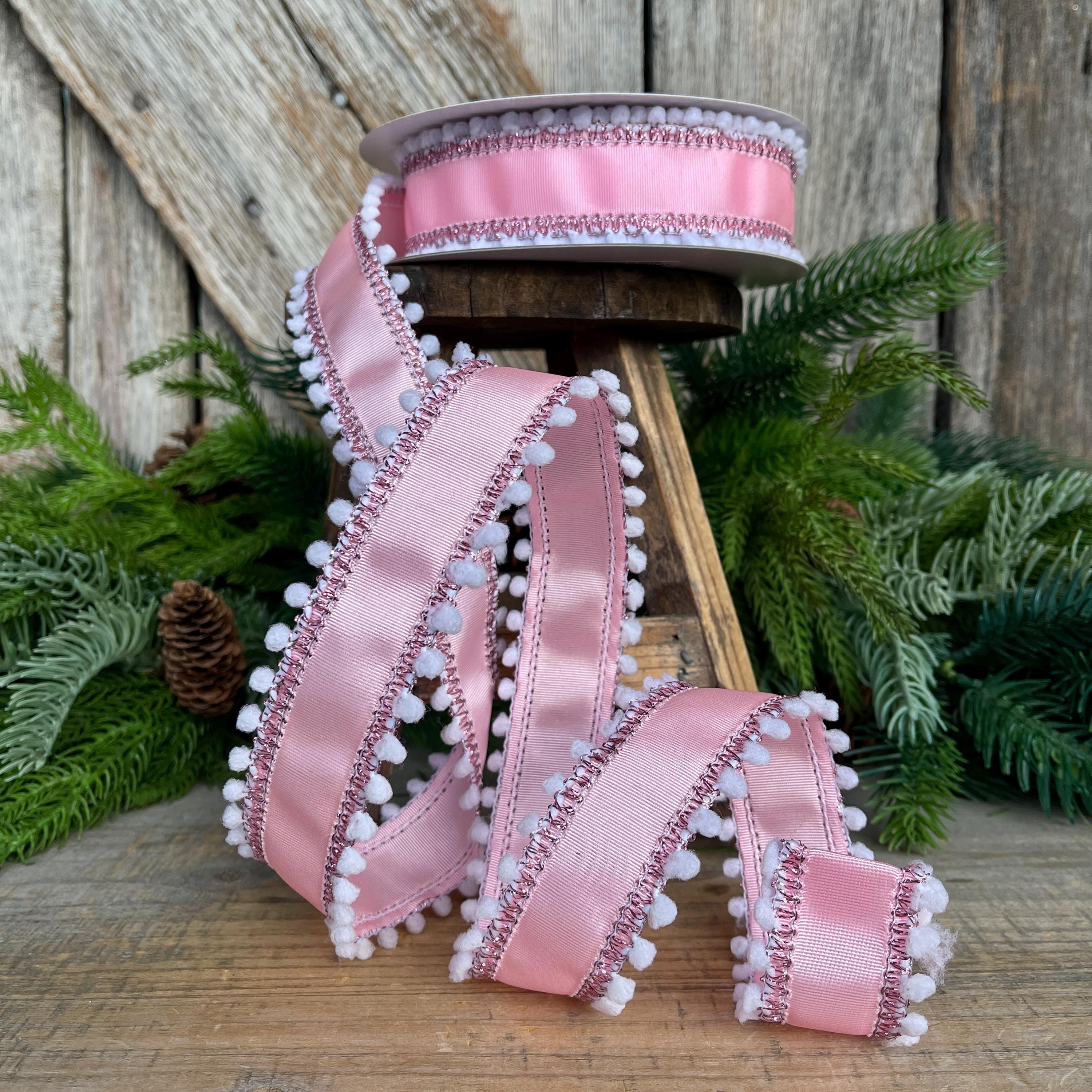 Add a soft, whimsical touch to your designs with this 1.5-inch pink ribbed satin wired ribbon featuring white snowball pom edging. The subtle sheen of the ribbed satin paired with playful textured trim creates a charming, high-end look that stands out beautifully in bows and wreaths.
