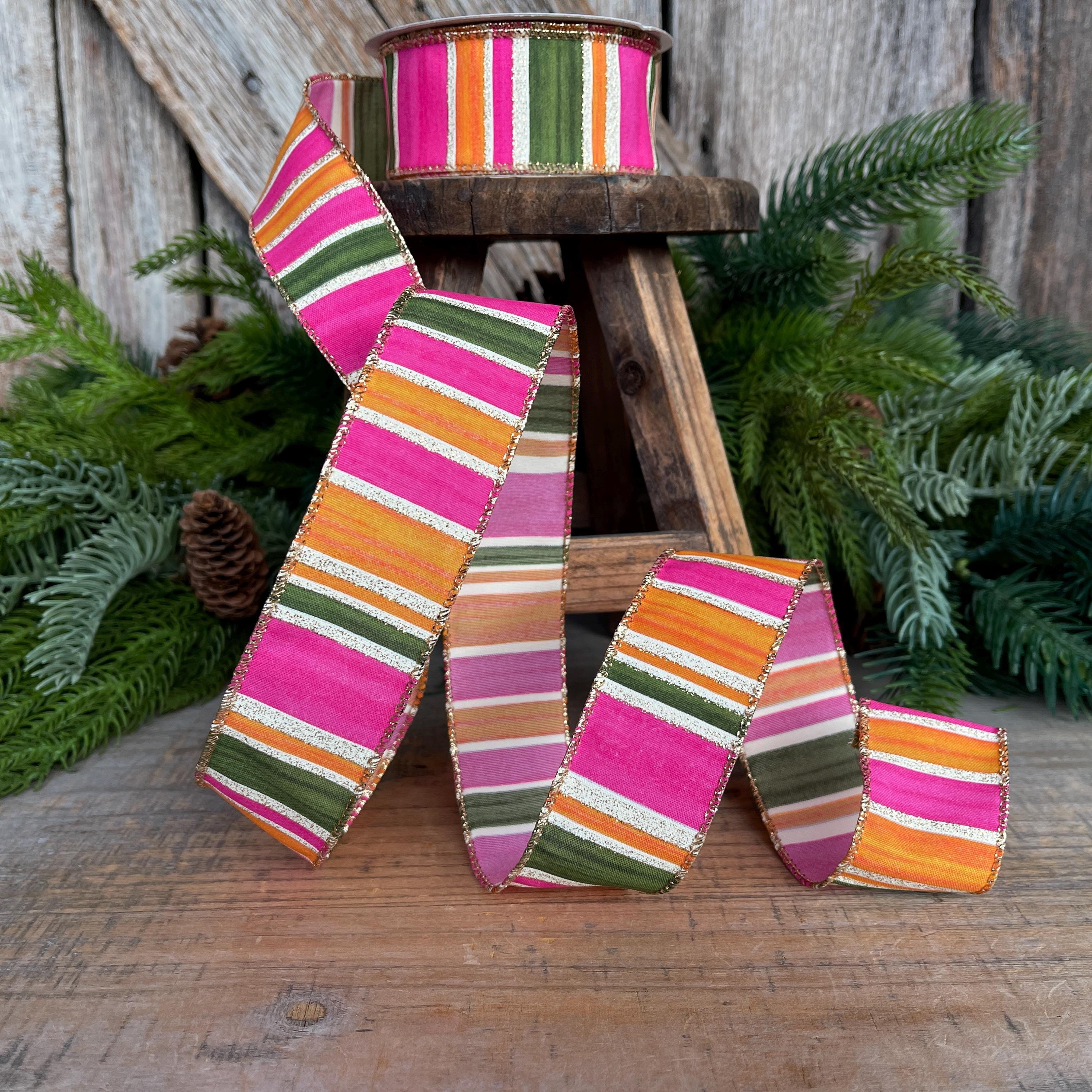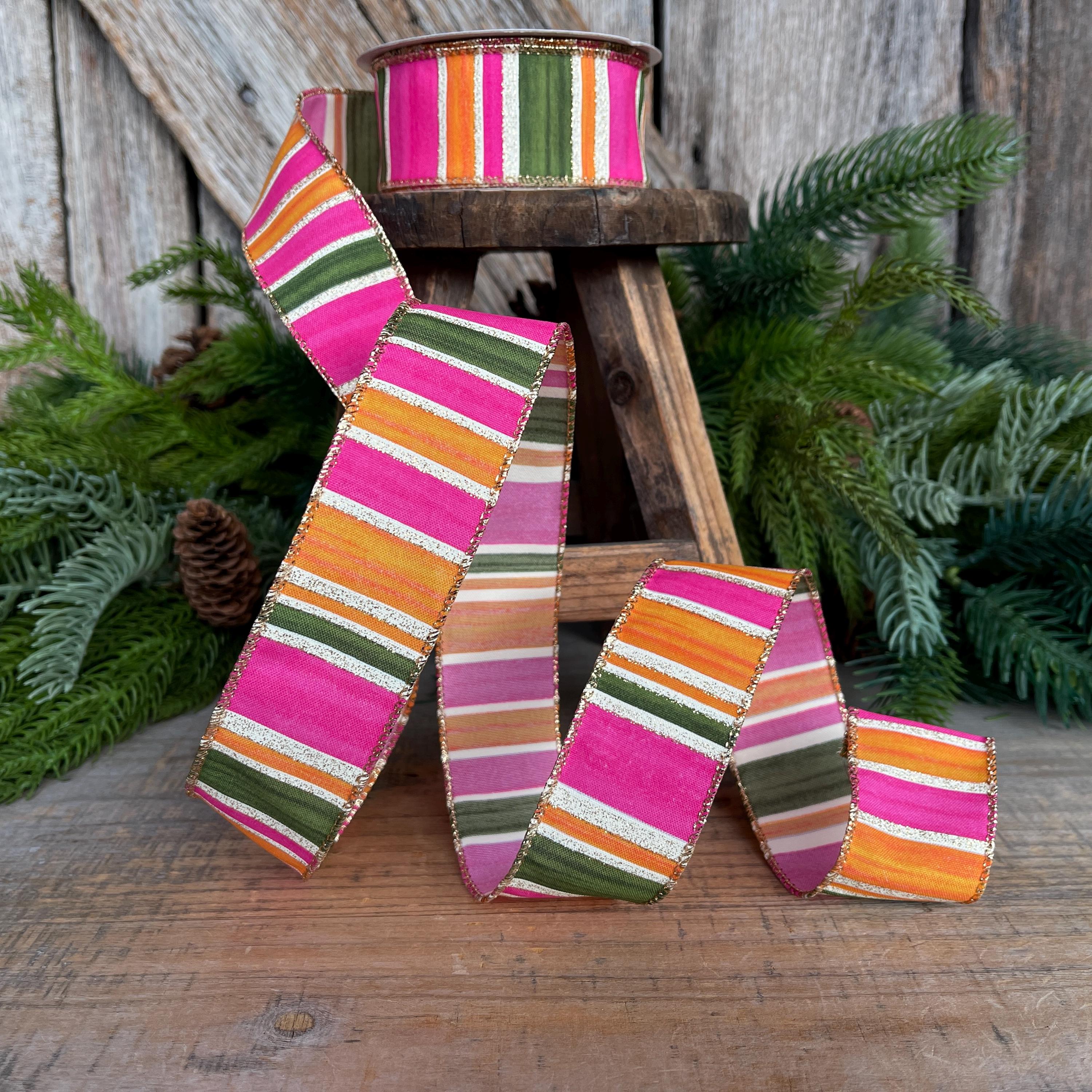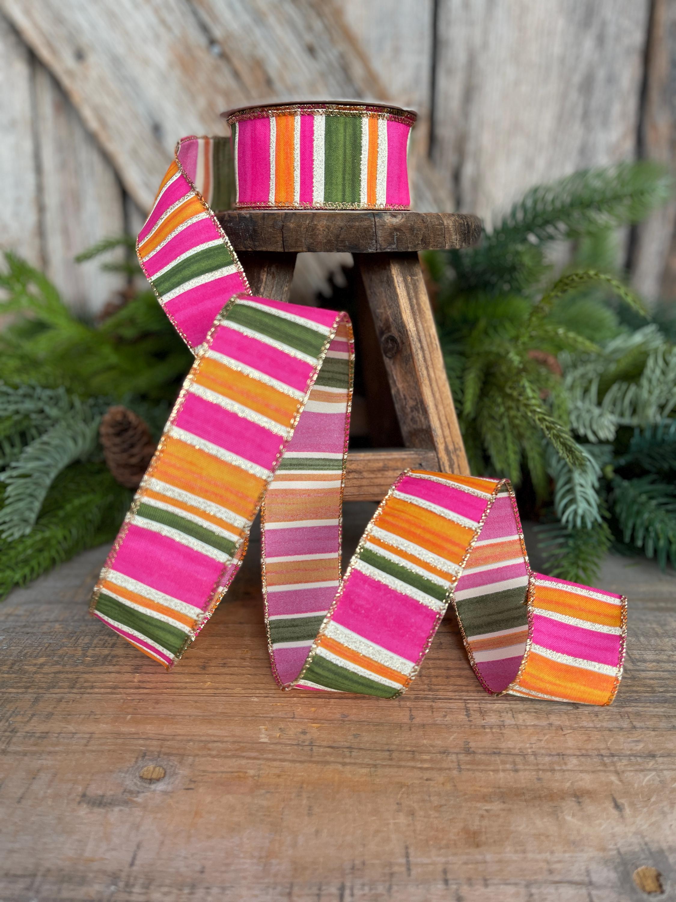 Bring bold color and designer flair to your projects with this stunning watercolor striped ribbon. Featuring vibrant pink, moss green, and orange horizontal stripes accented with a gold glitter edge, this ribbon adds the perfect pop to wreaths, bows, gift wrapping, and seasonal décor.