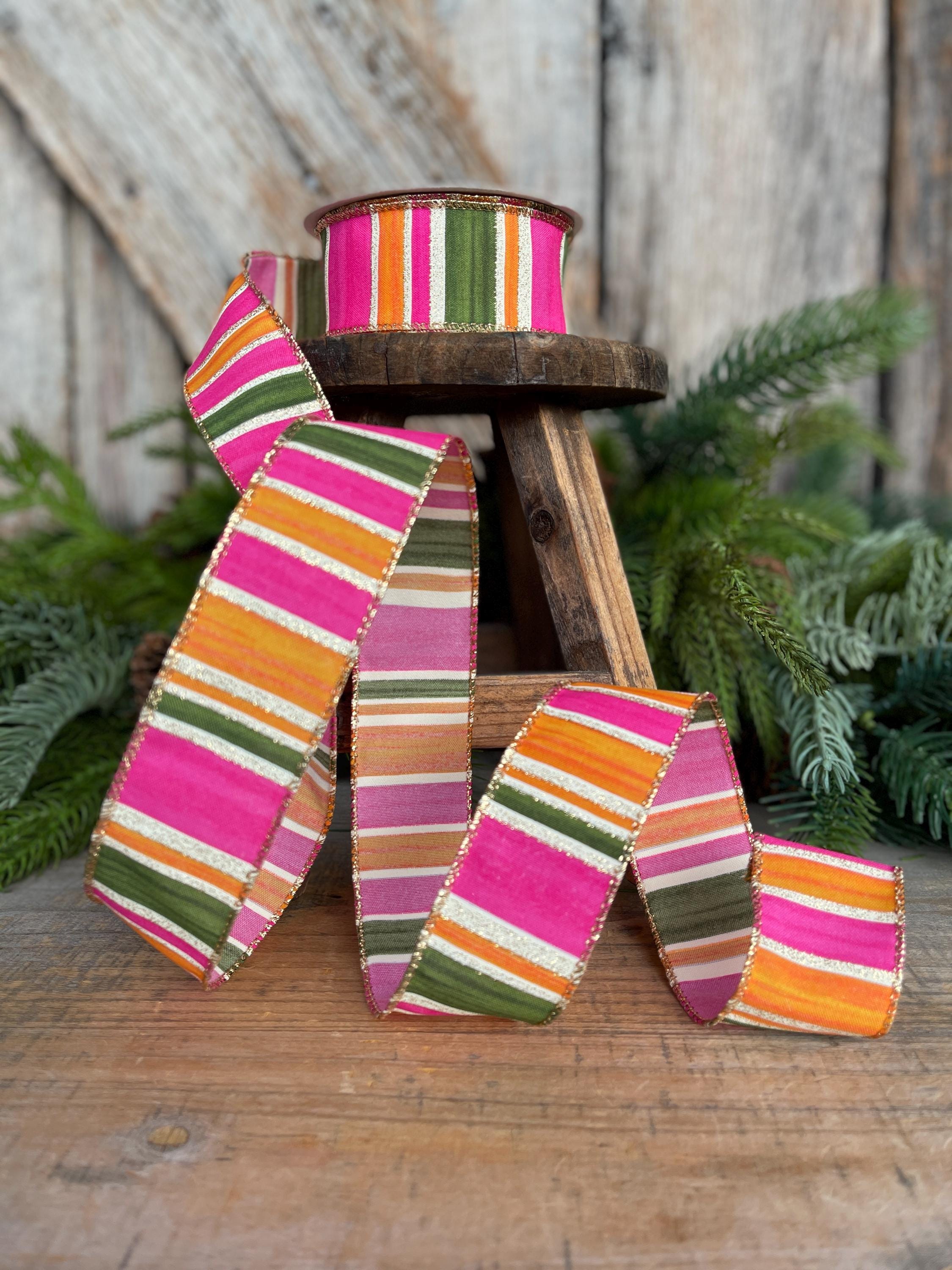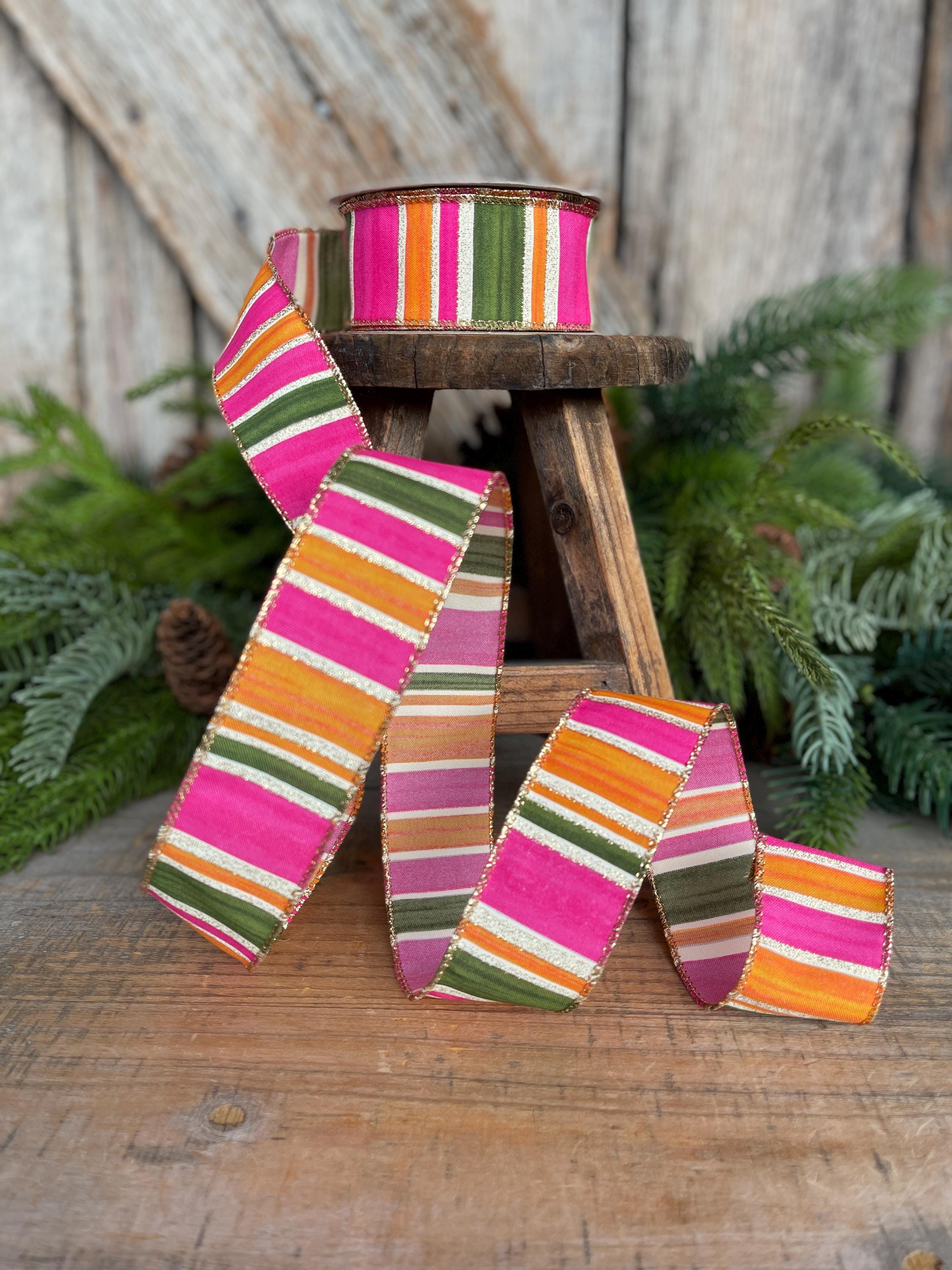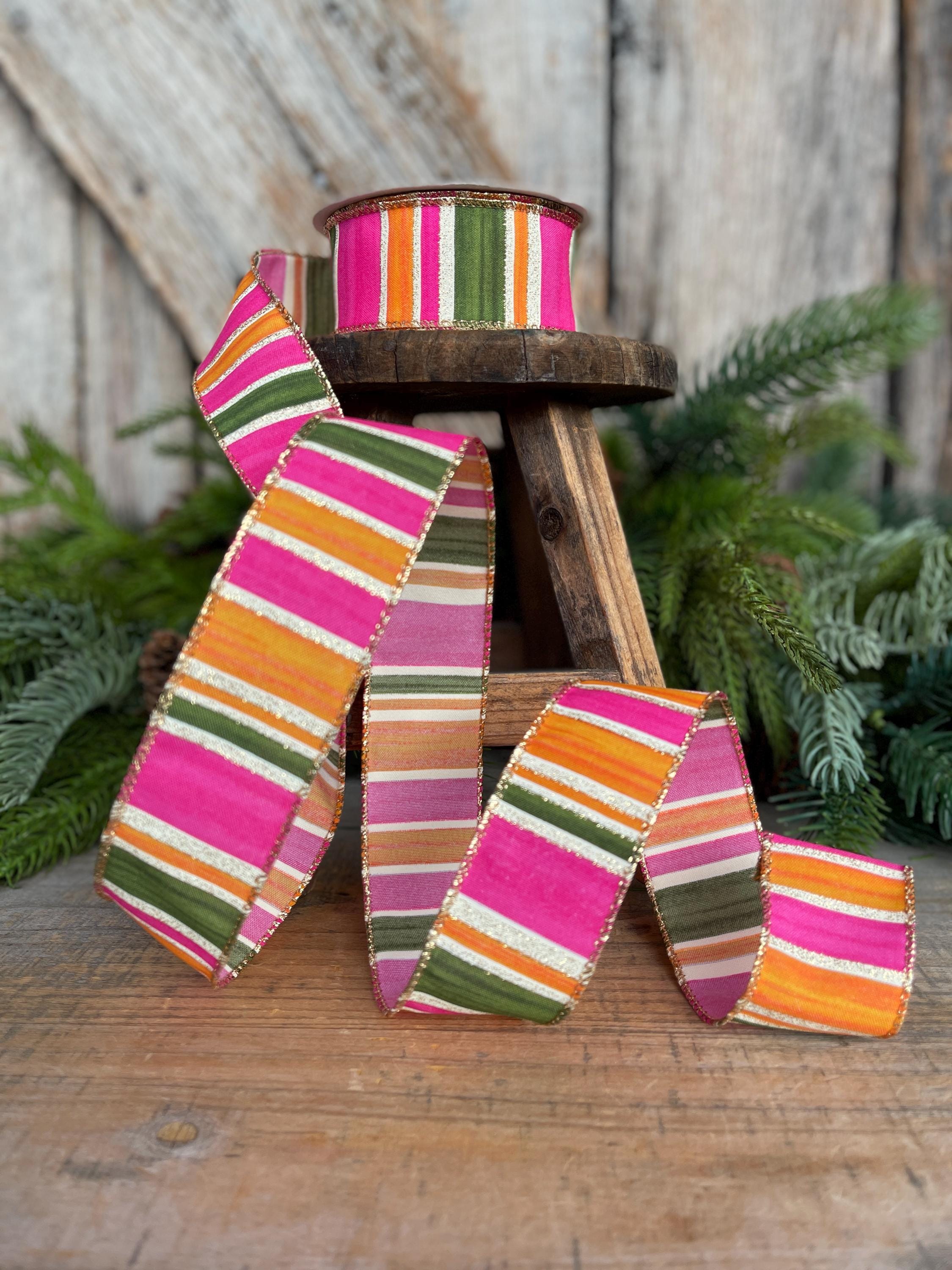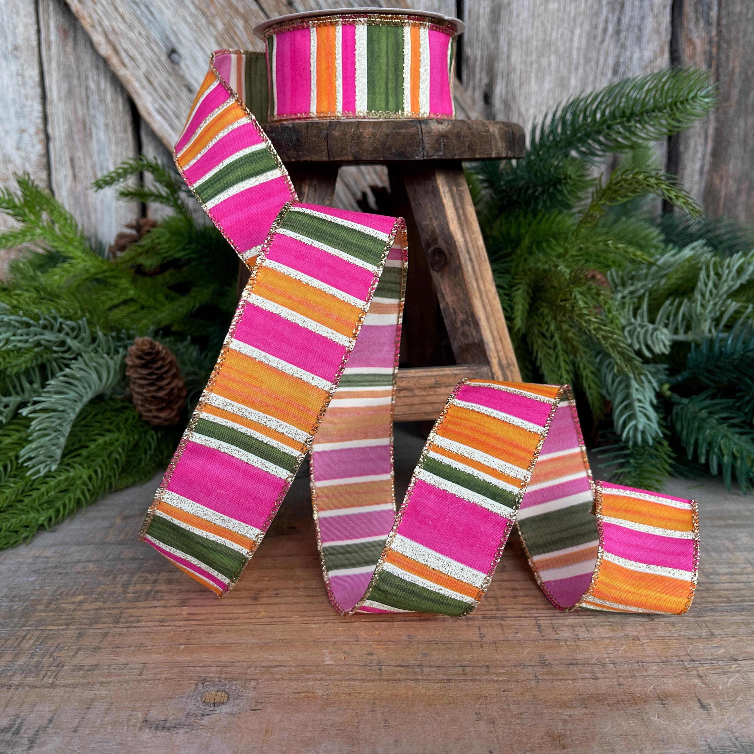 Bring bold color and designer flair to your projects with this stunning watercolor striped ribbon. Featuring vibrant pink, moss green, and orange horizontal stripes accented with a gold glitter edge, this ribbon adds the perfect pop to wreaths, bows, gift wrapping, and seasonal décor.